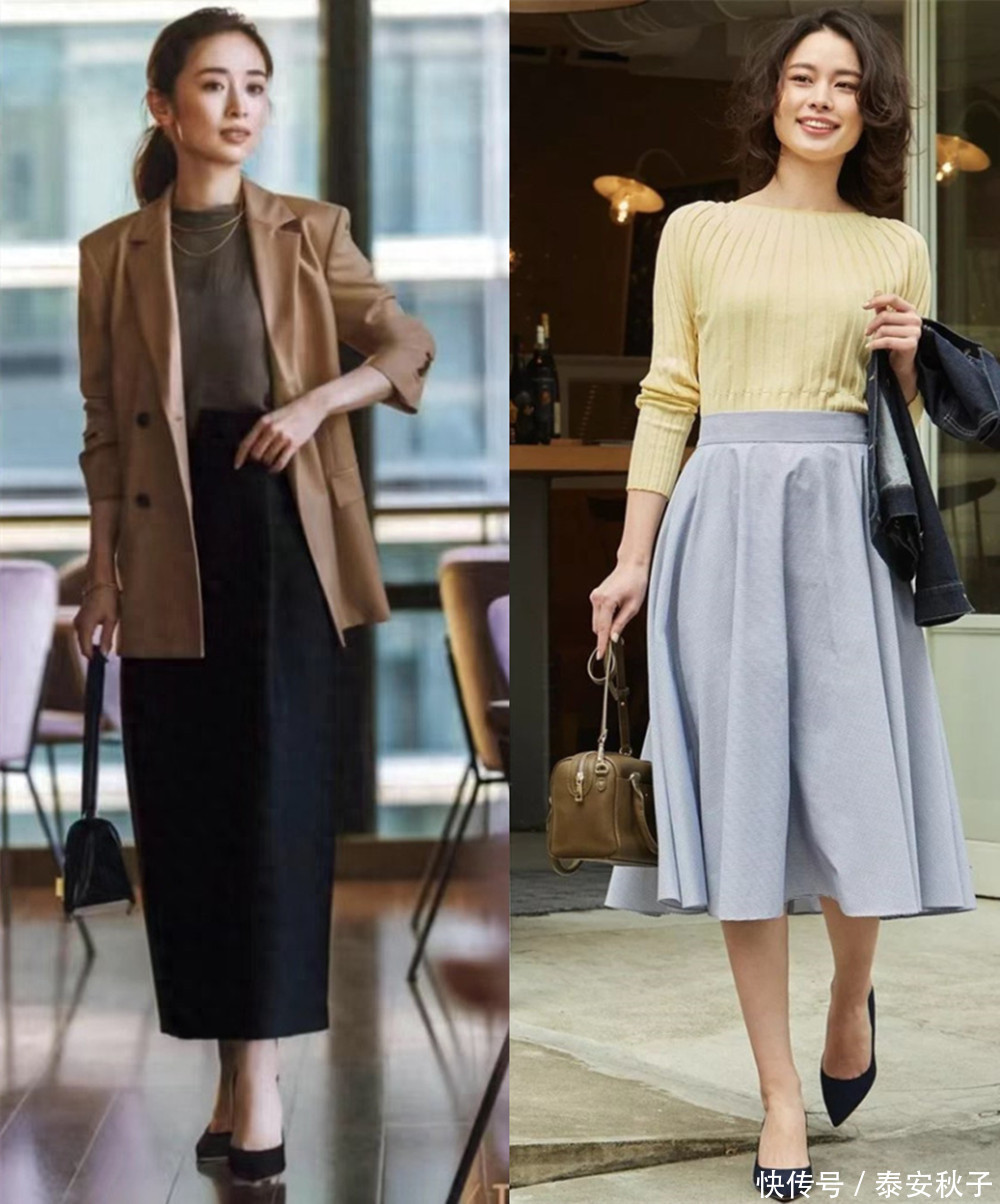 今秋时节里,这种及膝长度的中长款半身裙,有着很高的上身率。
