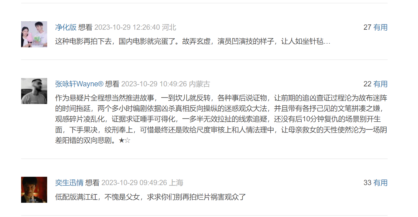 再来看豆瓣,差评则以压倒性的比例完胜。翻看最新评述,有不雅众写谈“这种电影再拍下去,国内电影就完蛋了。莫测高深,演员凹演技的方式,让东谈主芒刺在背…”。