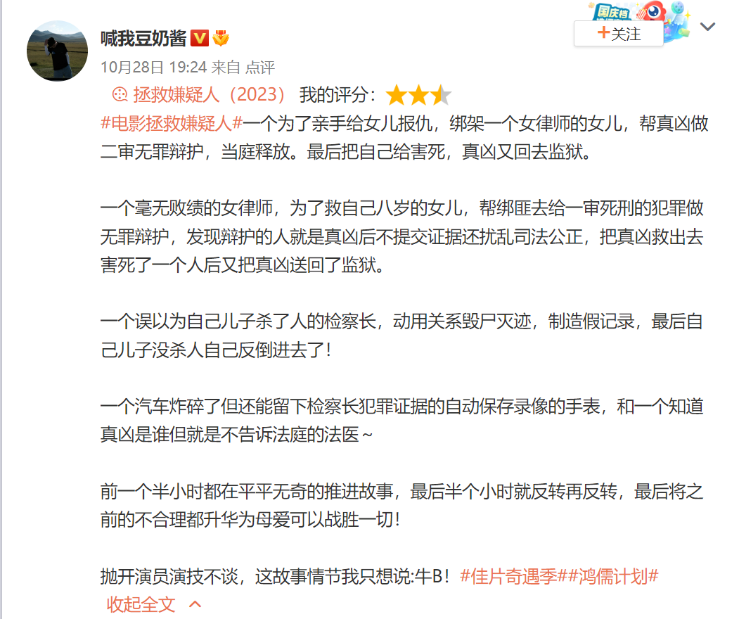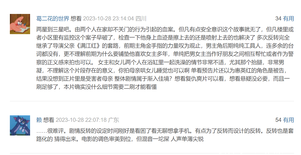 影评东谈主“碟中谍”也给出两星半,前边驳诘电影“为什么用那么屡次的关键根据救场?为什么大回转把《误杀》式反昭彰洗白白?为什么恶民有罪不作念铺垫?为什么要梅花绑匪不法?”背面也吐槽张小斐,觉得她“嫩了点”,比惠英红充满苦衷感的嗜好要差之许多。