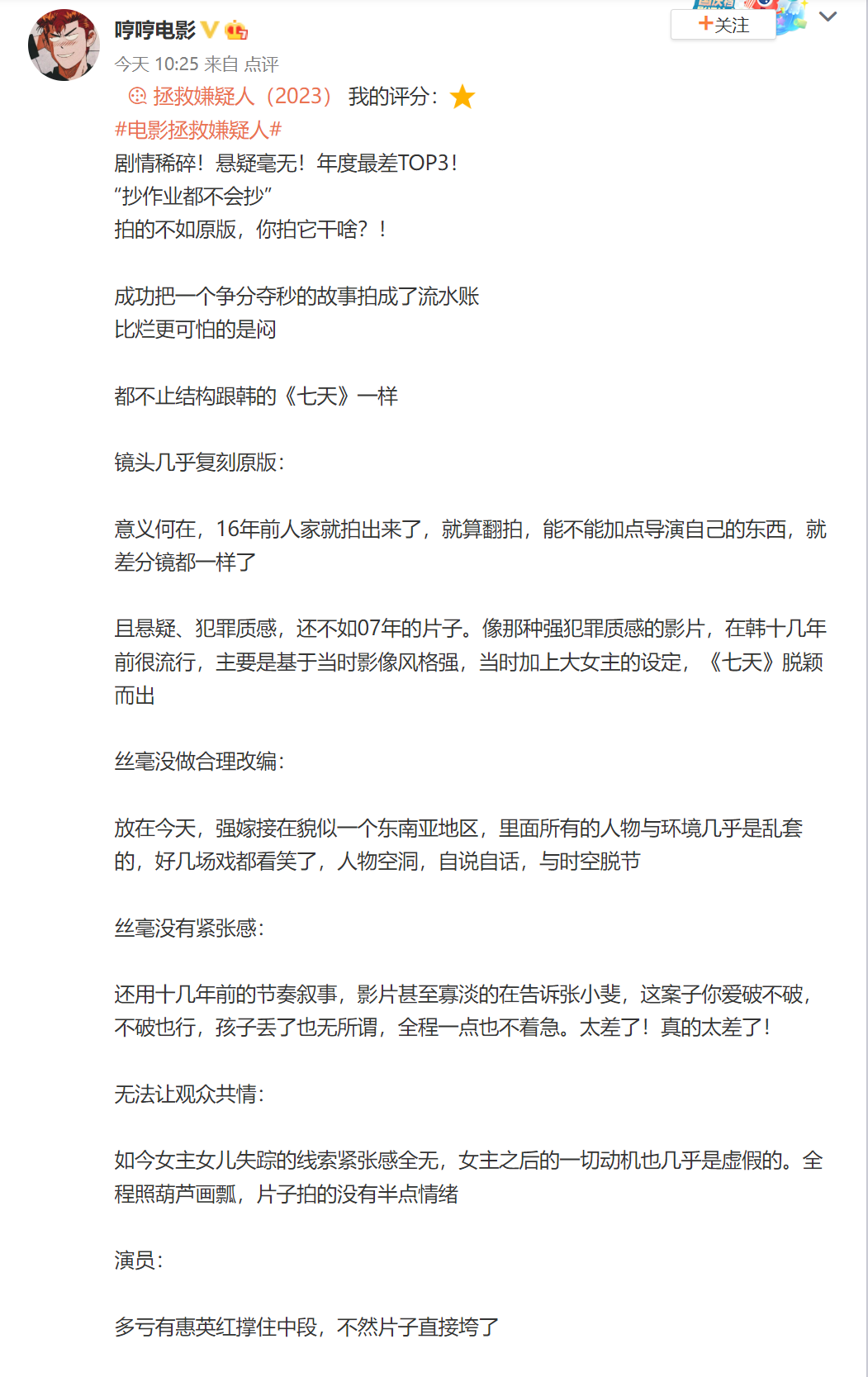 固然,酬酢平台上也有一些莫得收取片方平允的影评东谈主给出了相对客不雅的评价。比如“哼哼电影”只给电影打出一星,第一句等于“剧情稀碎!悬疑毫无!年度最差TOP3!”还直指电影“抄功课皆不会抄”,觉得电影和韩国的《七天》叠加,镜头着实复刻原版,而槽点包括但不限于莫得合理改编、莫得垂危感、无法让不雅众共情等等,觉得多亏有惠英红,否则片子获胜垮了。还吐槽“张小斐演的不像讼师,探案流程莫得涓滴专科学问手段训诲,撑不起女主。”